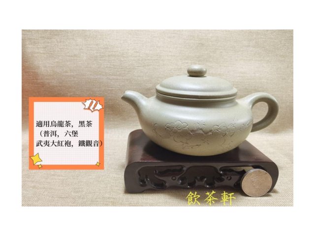 宜興紫砂 豆青泥 仿古壺 梅花刻繪 40目 300ml 附壺繩