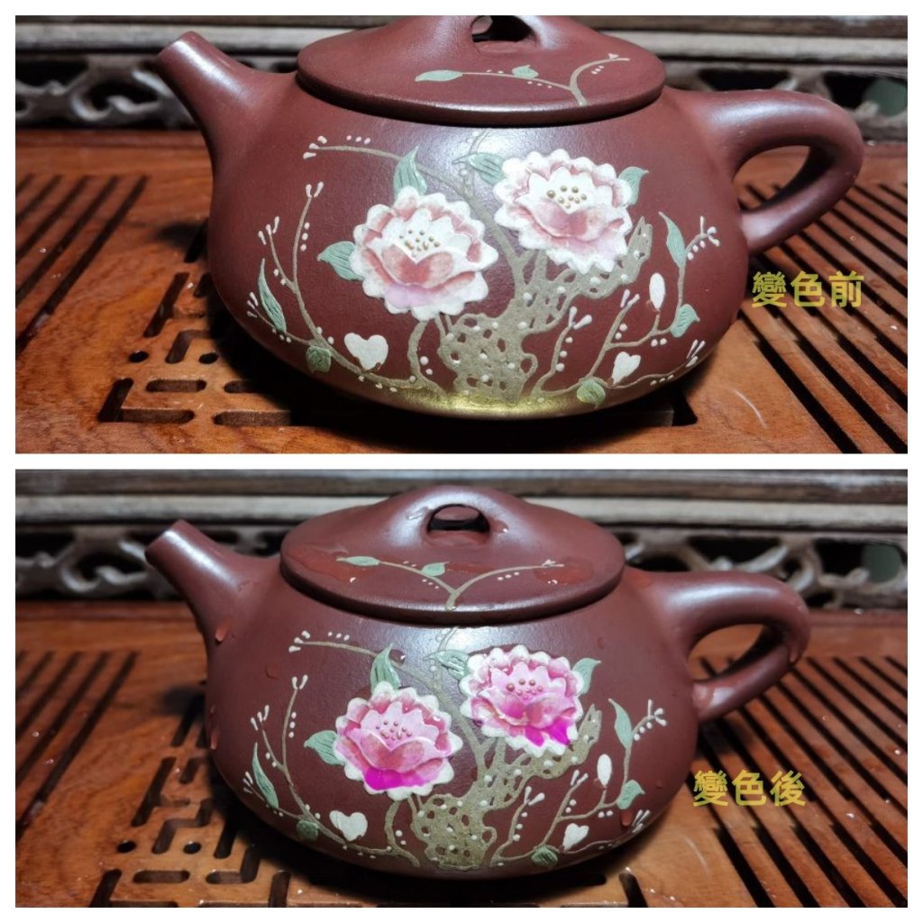 而這款壺,更是採用了變色紫泥,遇到熱水時,壺身顏色會發生變化,如同牡丹花開,絢麗多姿。