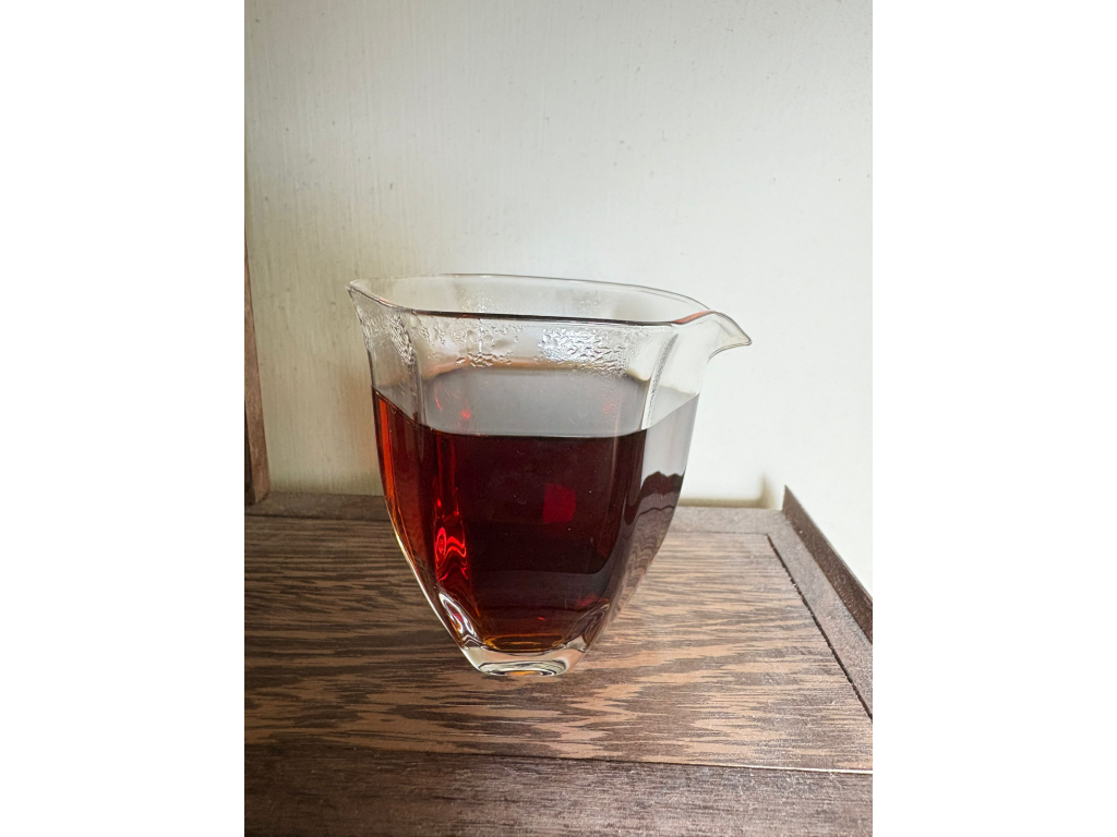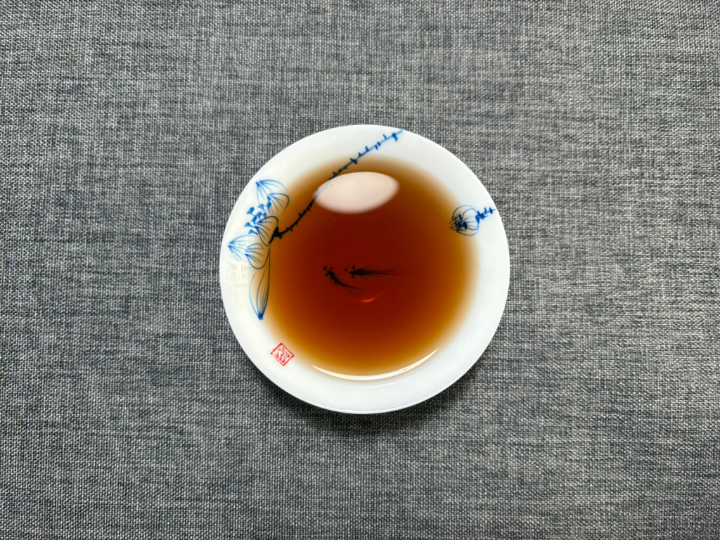 湯色:琥珀紅濃透亮,晃動公道杯時,茶湯如綢緞般掛壁,油潤感肉眼可見。
