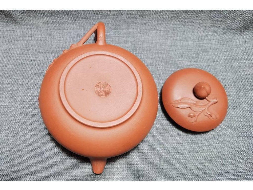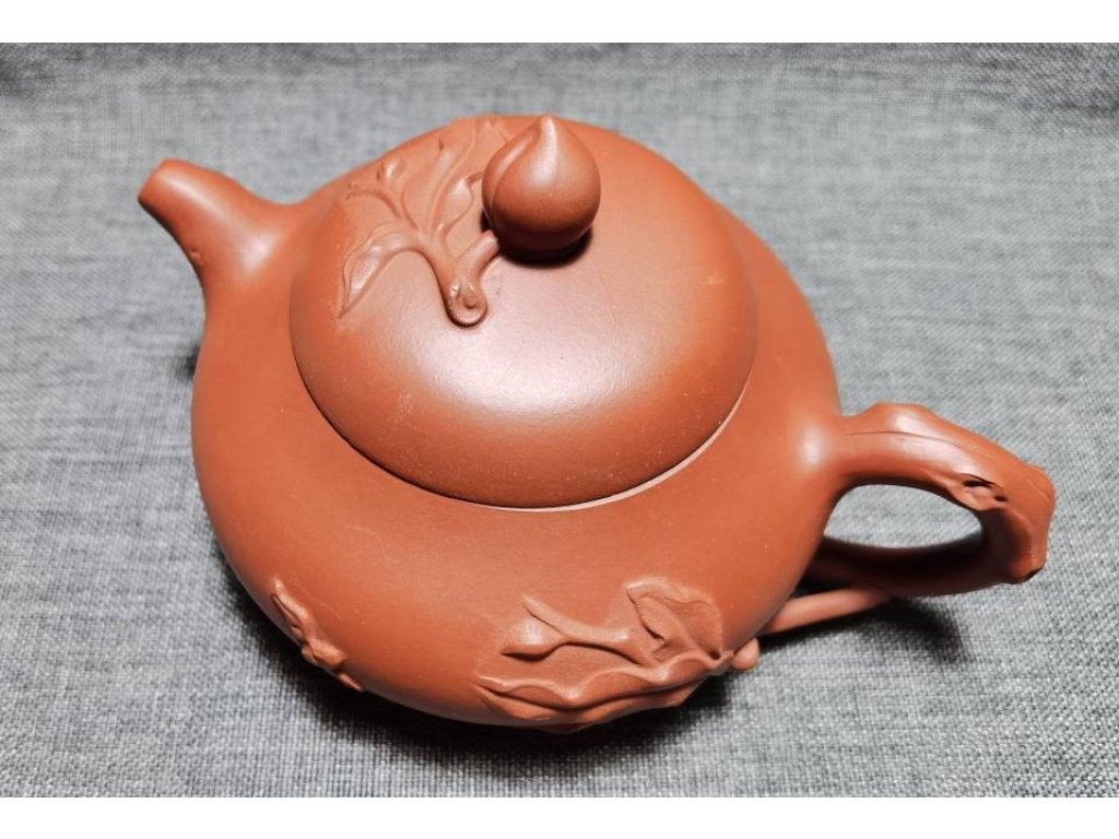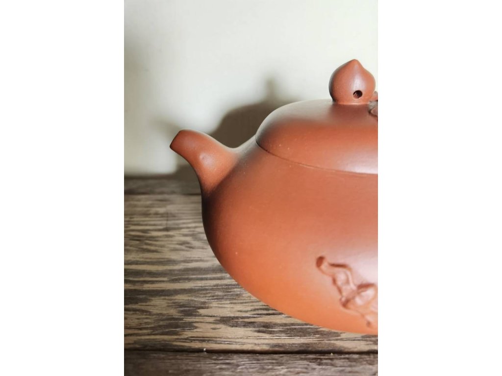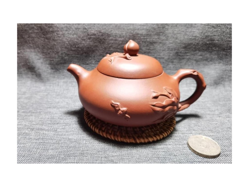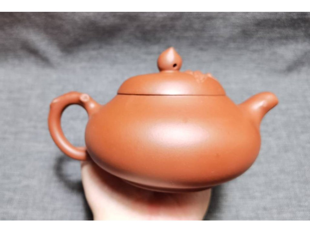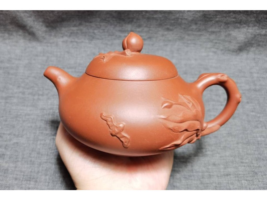 宜興紫砂 大紅袍 貼花 壽桃壺 70目 250ml