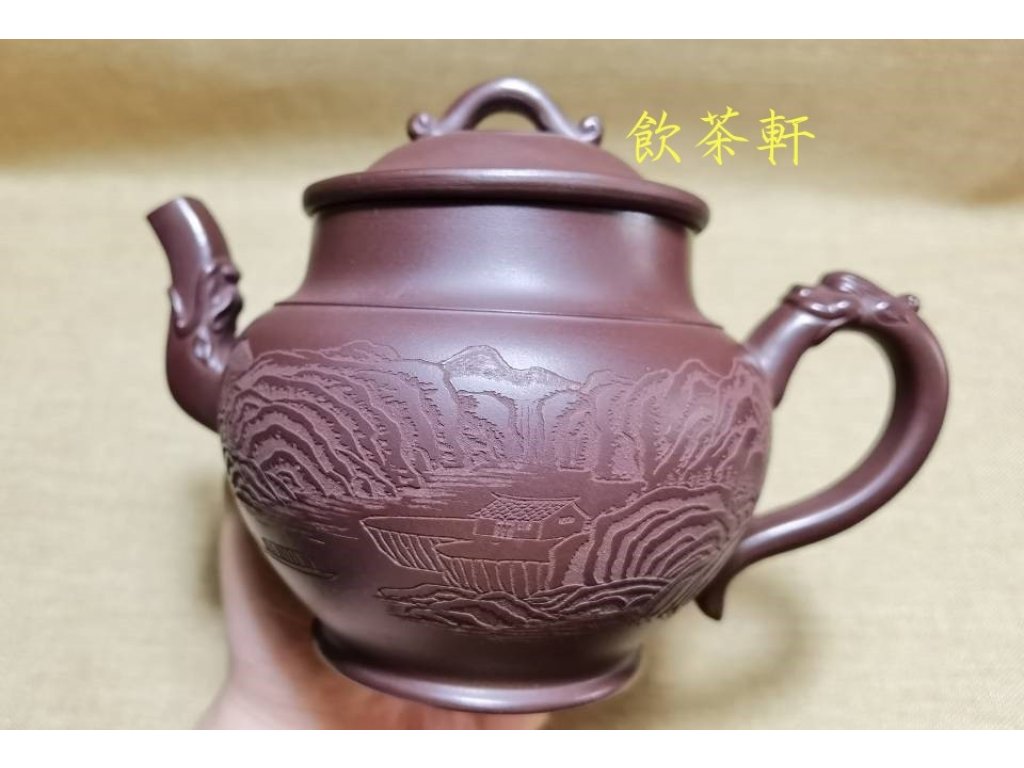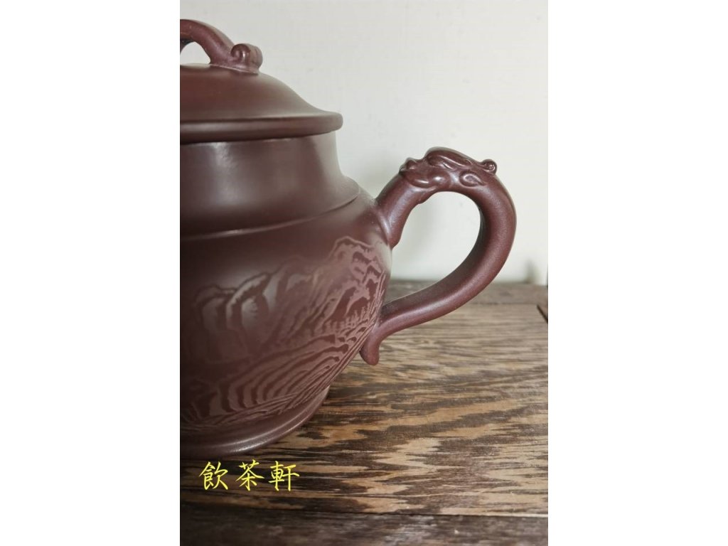壺身正面,一幅氣勢磅礴的山景圖刻繪其上。山巒起伏,雲霧繚繞,仿佛將人帶入了一個幽靜的山林世界。