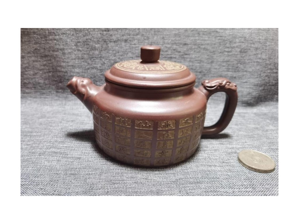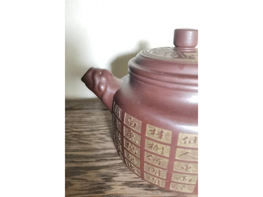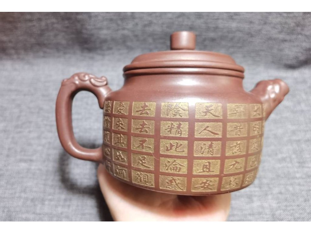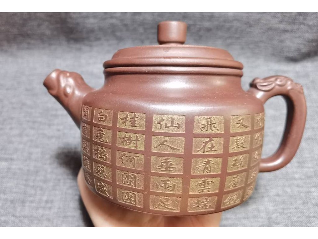 壺身上,陽刻的古郎月行詩句以方形印章形式排列,錯落有致,為這把壺增添了濃厚的文化氣息和歷史厚重感。