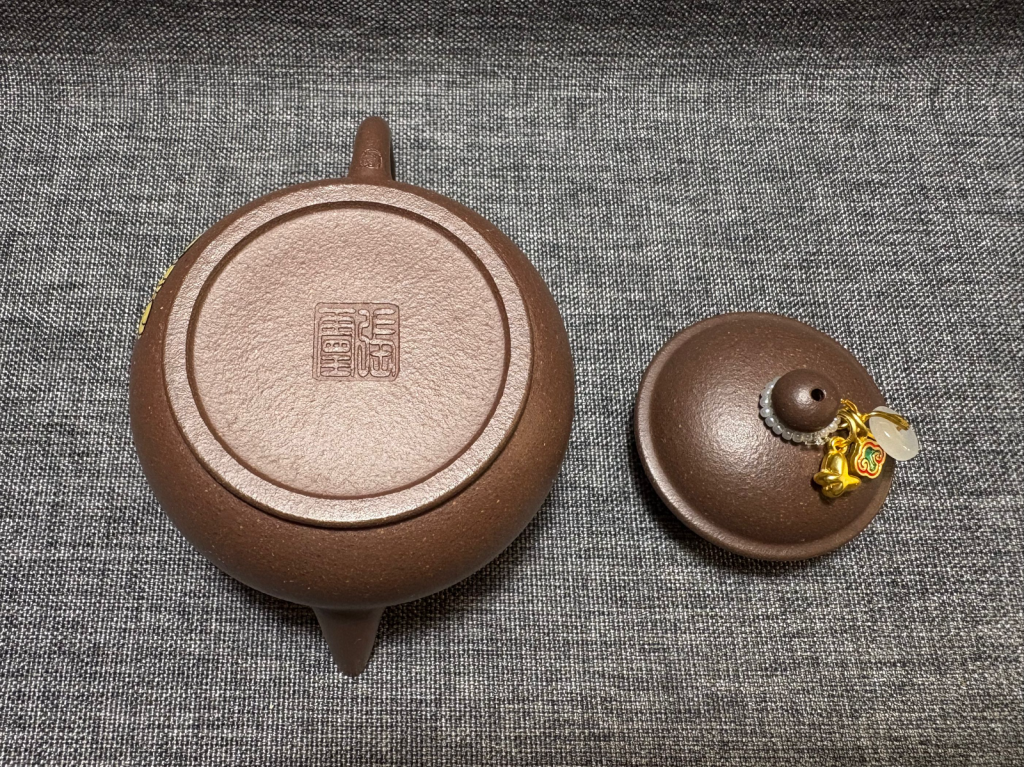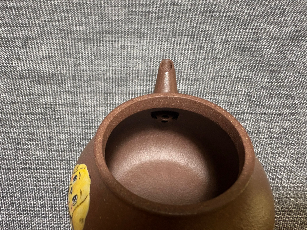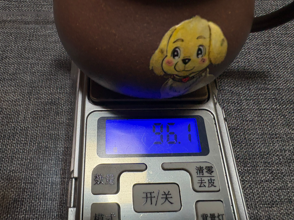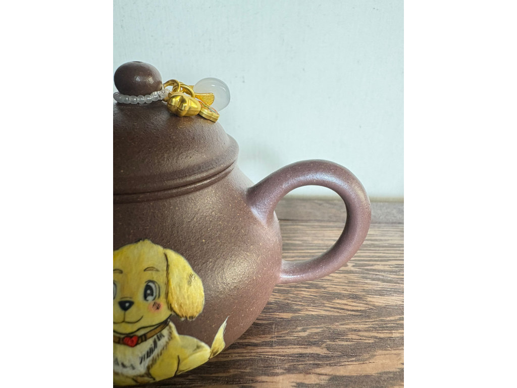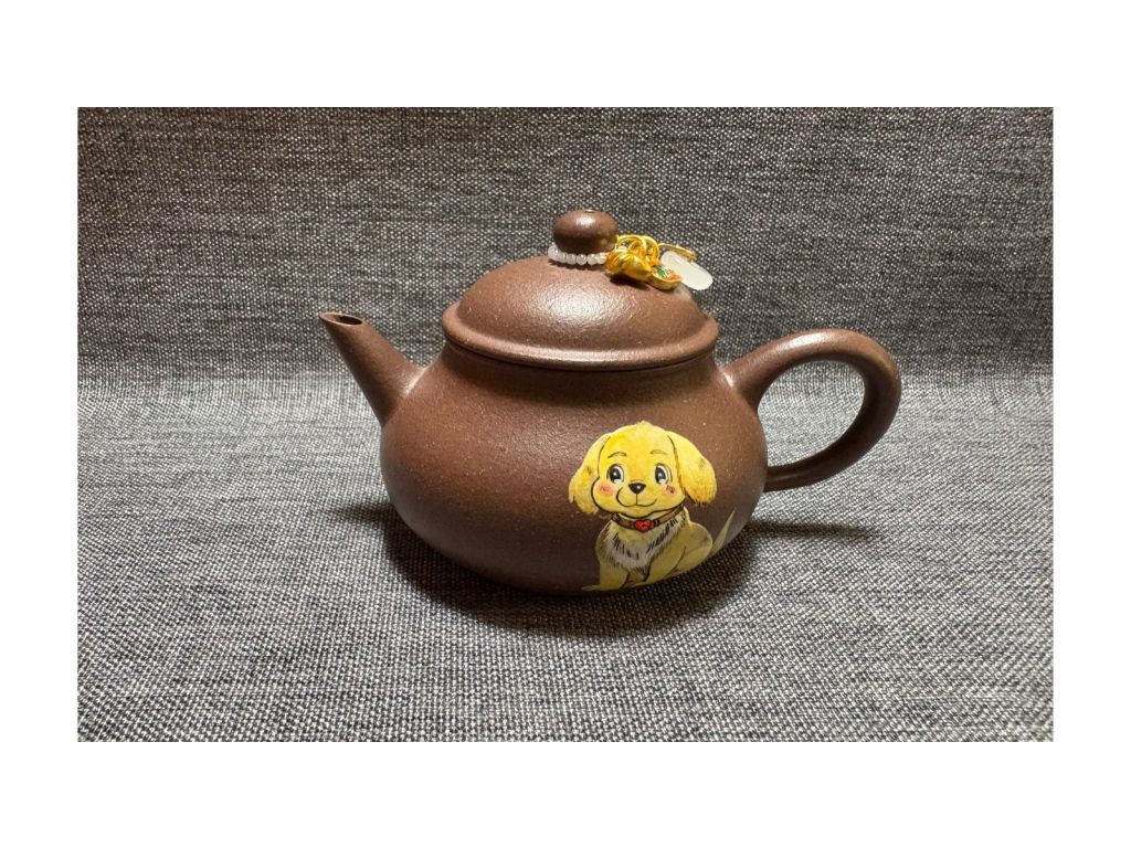 於壺身手繪的黃小狗圖案。手繪工藝作為紫砂壺裝飾的傳統手法,以其細膩的筆觸和生動的表現力,為紫砂壺增添無限的藝術魅力。壺身上的黃小狗,畫工精細,形態可愛,在壺身上歡快地跳躍。