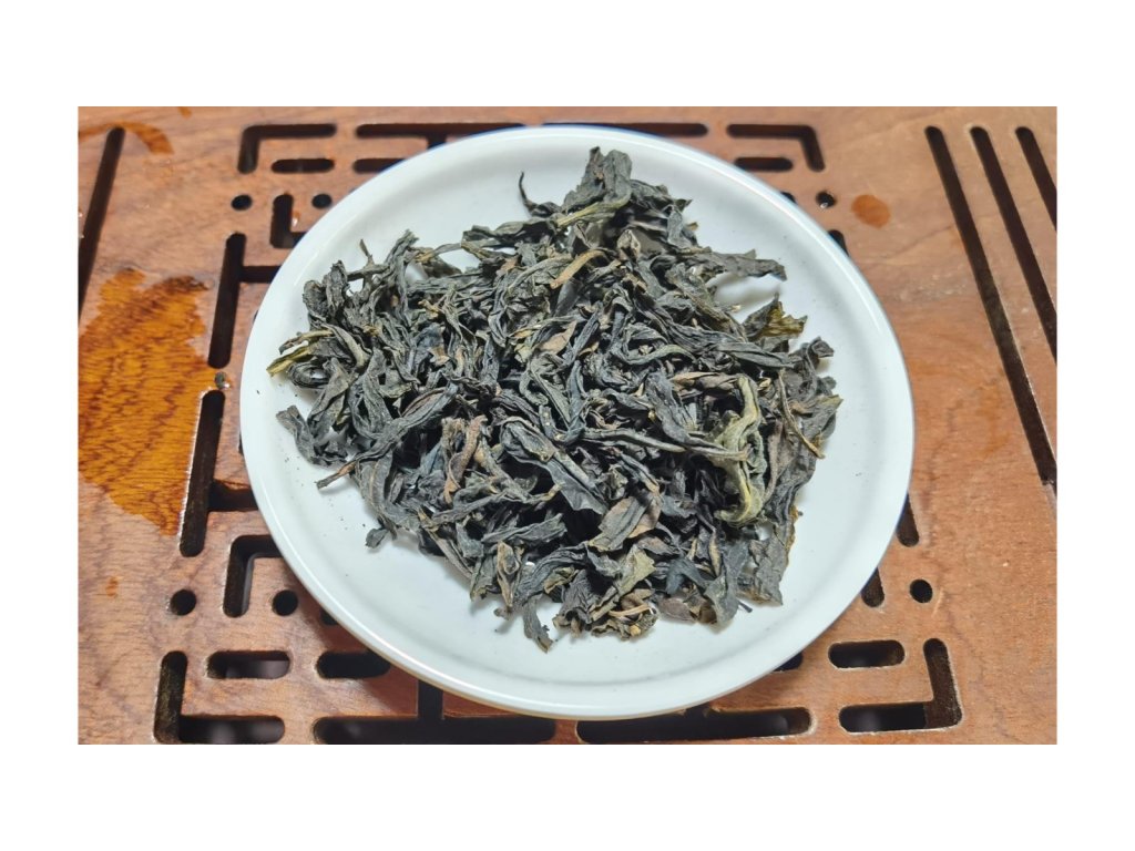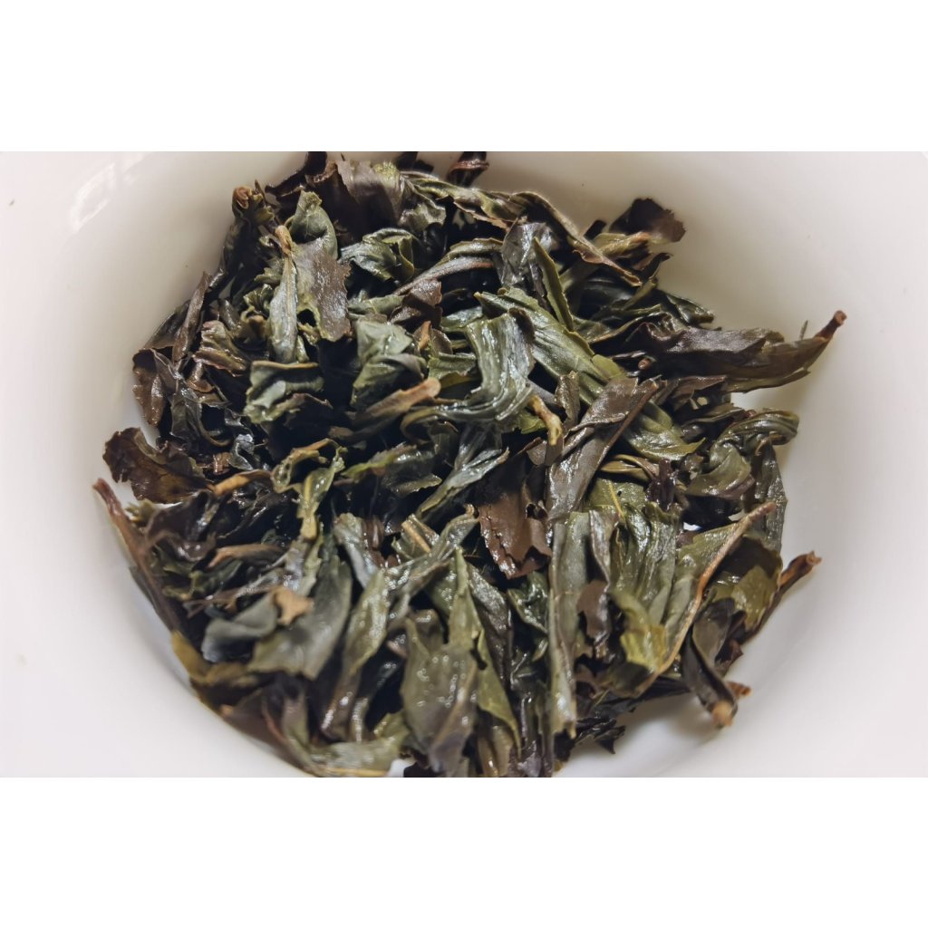 外形條索緊結,葉片扭曲,色澤烏潤有寶光。其條索的緊結程度和葉片的完整度顯而易見,色澤上的砂綠隱現也是優質大紅袍的特徵之一。